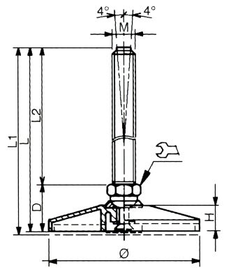 Piedino con base di appoggio in poliammide rinforzato. Stelo filettato rilevabile dalla tabella. Versione antivibrazione dotata in gomma resistente all'olio, durezza 70 shore.