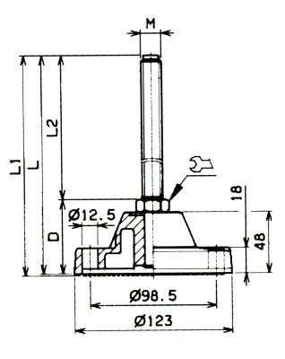 Piedino con base di appoggio in poliammide rinforzato. Stelo filettato rilevabile dalla tabella. Gomma antivibrazione resistente all'olio, durezza 70 shore. Possibilità di ancoraggio al suolo