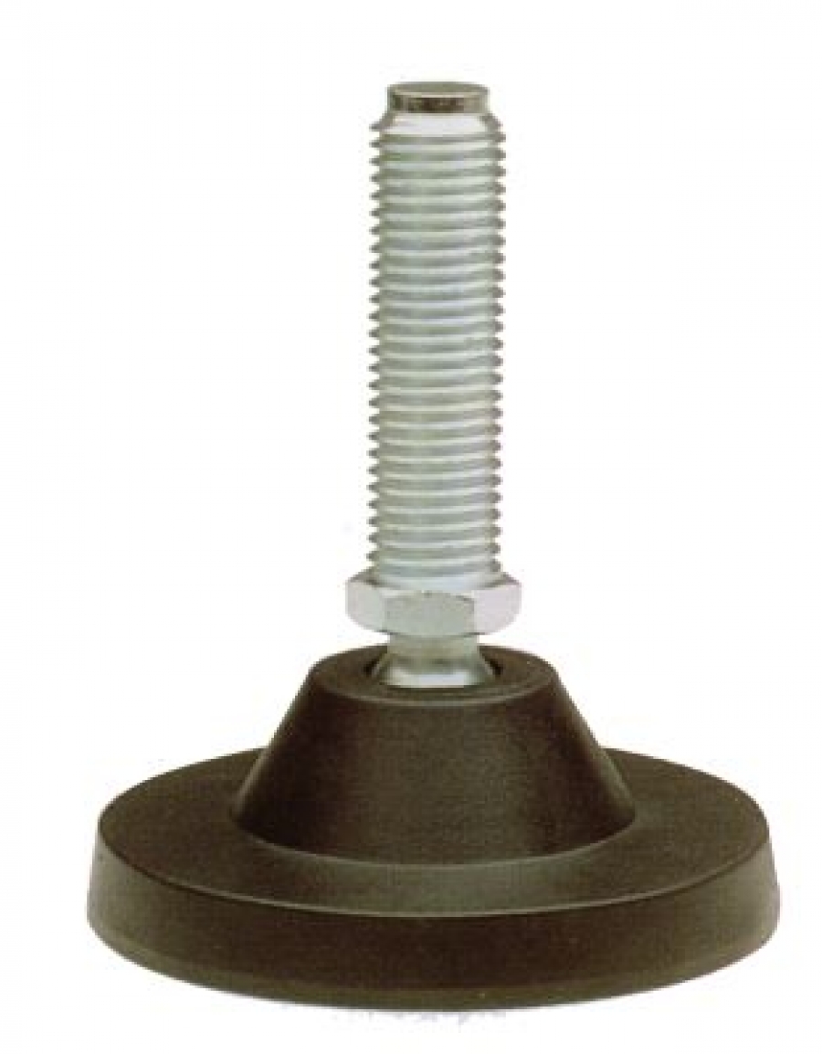 Piedino con base di appoggio in poliammide rinforzato. Stelo filettato rilevabile dalla tabella. Gomma antivibrazione resistente all'olio, durezza 70 shore. Possibilità di ancoraggio al suolo mediante l'apertura del diaframma contrassegnato