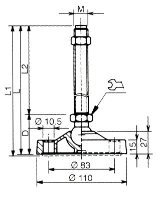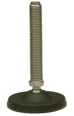 Piedino con base di appoggio in poliammide rinforzato. Stelo filettato rilevabile dalla tabella. Gomma antivibrazione resistente all'olio, durezza 70 shore. Possibilità di ancoraggio al suolo mediante l'apertura del diaframma contrassegnato
